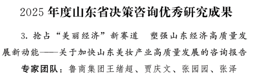 近日,山東省決策咨詢委員會(huì)發(fā)布《關(guān)于表揚(yáng)2025年度山東省決策咨詢優(yōu)秀研究成果的通報(bào)》,對(duì)全省12項(xiàng)高質(zhì)量決策咨詢優(yōu)秀研究成果予以通報(bào)表揚(yáng)。由魯商集團(tuán)撰寫的研究報(bào)告《搶占“美麗經(jīng)濟(jì)”新賽道 塑強(qiáng)山東經(jīng)濟(jì)高質(zhì)量發(fā)展新動(dòng)能——關(guān)于加快山東美妝產(chǎn)業(yè)高質(zhì)量發(fā)展的咨詢報(bào)告》成功入選,榮獲省級(jí)表彰。