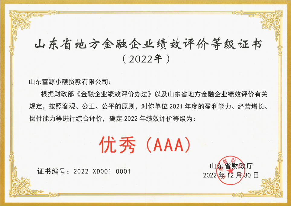 近日,富源小貸榮獲省財(cái)政廳頒發(fā)的2022年山東省地方金融企業(yè)績效評(píng)價(jià)“優(yōu)秀(AAA)”等級(jí)證書,這是公司連續(xù)4年獲此殊榮。